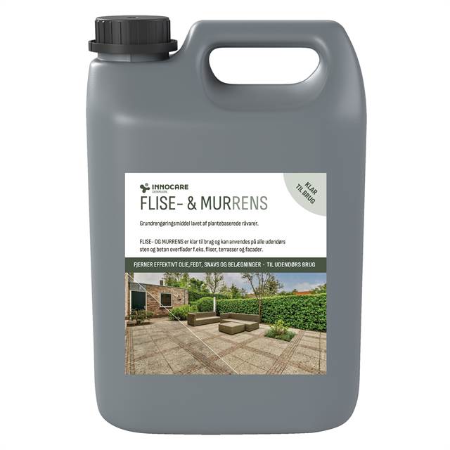 FLISE- & MURRENS er et effektivt flydende grundrengøringsmiddel til ubehandlede fliser, murværk og beton udendørs, lavet af plantebaserede råvarer. Produktet er klar-til-brug.