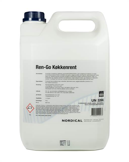 Anvendes til rengøring i køkkener og levnedsmiddelindustrien, samt rengøring af maskiner. Er meget anvendelig til langt de fleste overflader som gulve, vægge og lofter. Den høje pH-værdi bekæmper mange slags vira. Affaldscontainere og andre områder til opbevaring af affald, transportcontainere, lager- og fryselokaler kan rengøres med Ren-Go Køkkenrent. Også velegnet til køle- og omlæsserum i fødevareindustrien.