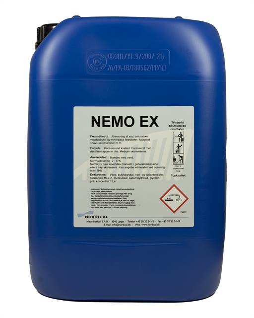 NEMO EX er et miljøtilpasset, meget effektivt virkende rengøringsmiddel, der hurtigt opløser fedt, olie, truckspor, sod, trafikfilm, protein- og æggehvidestoffer, klorider og fastgroet snavs.