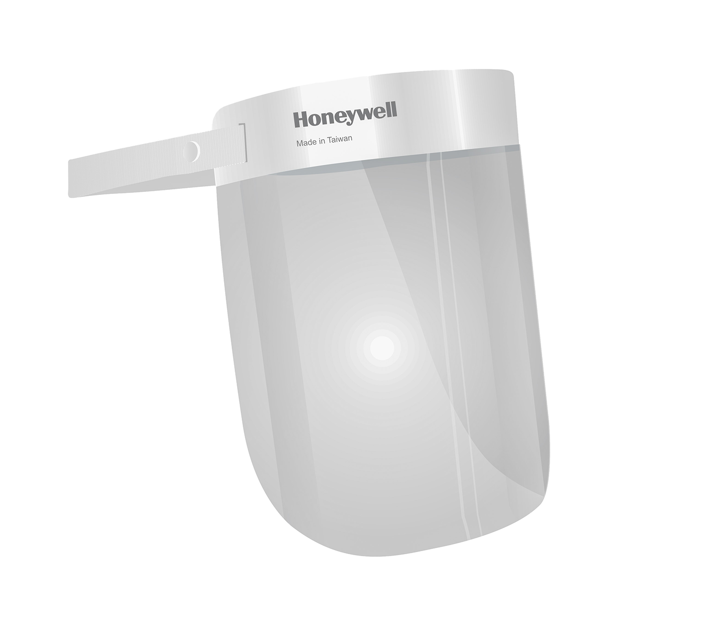 Skærm af genanvendeligt PET, tykkels 0,188 mm. Antidugbehandlet på indersiden. 30 mm afstandsstykke i skum. Pandeskjoldet monteres med elastikrem med trykknapper.